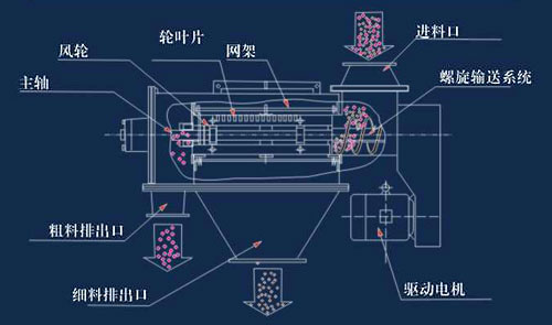 臥式氣旋篩(臥式氣流篩)工作原理: